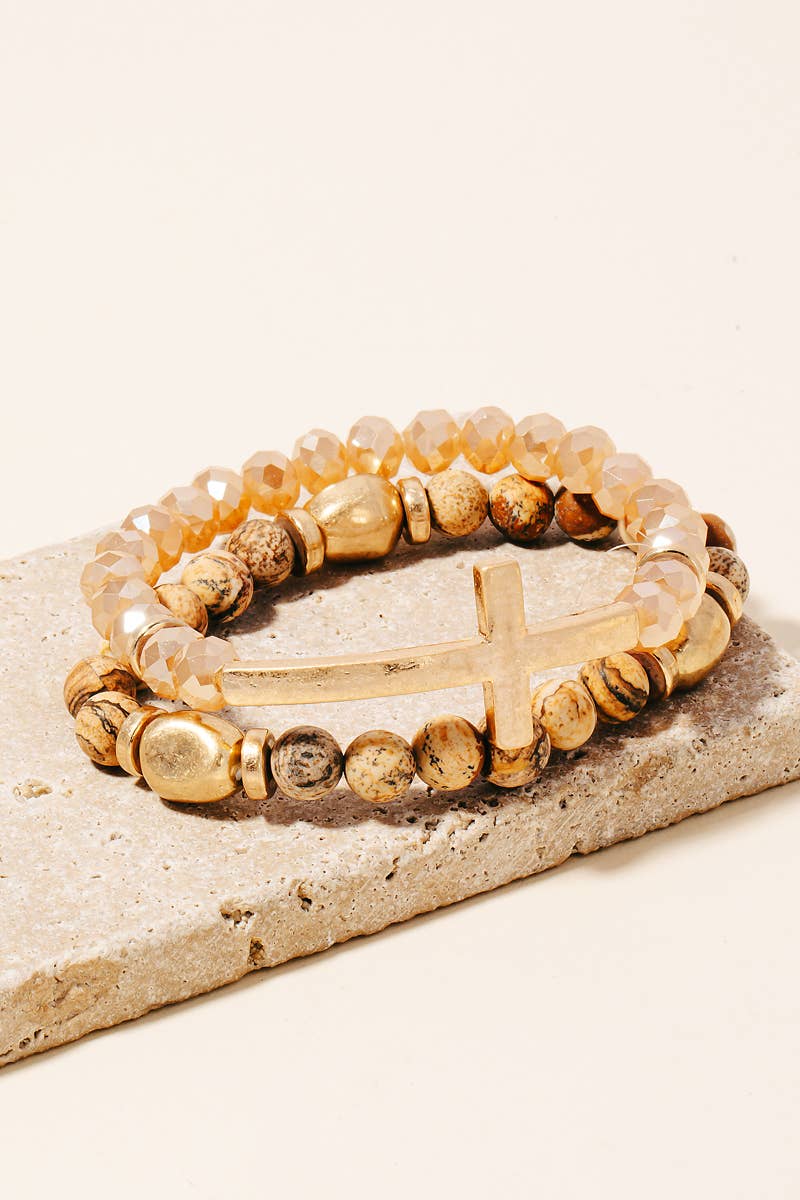 Cross Charm Stone Beaded Bracelet Set: BDWG