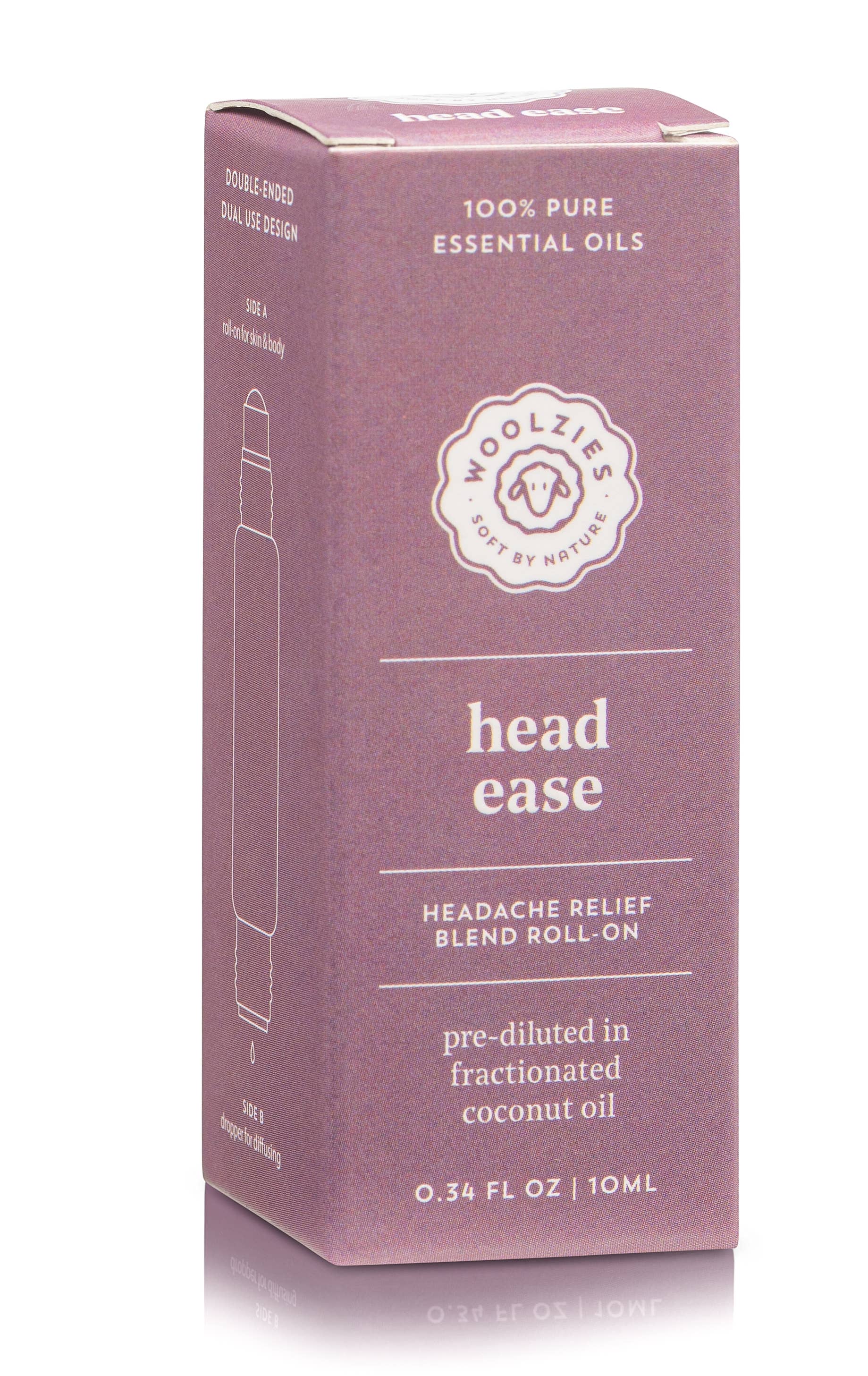 Woolzies Head Ache Oil Roll-On Blend is a pain-relieving blend that can help with headaches and tense muscles. It has a minty, earthy scent and contains basil, cardamom, rosemary, peppermint, geranium, lemon, palmarosa, bergamot essential oils and is diluted with Coconut Oil.