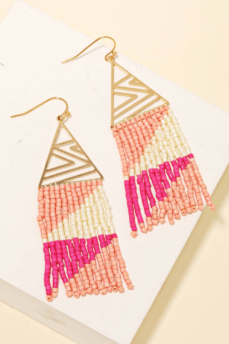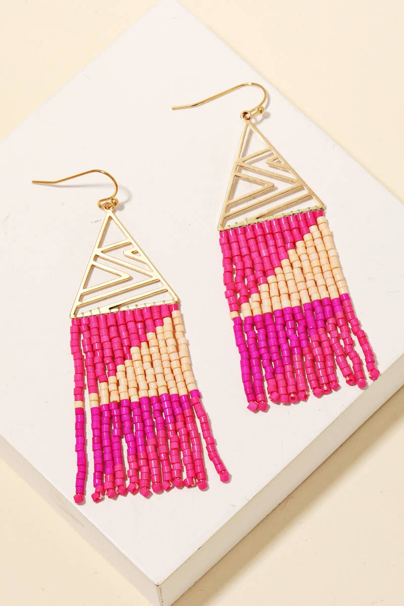 A must-have addition to any accessory collection, this pair of earrings adds a distinctive intricate triangle and beaded fringe earrings design. This item adds the perfect finishing touch to any outfit, making it stand out from the crowd. Available in FUCH, GRY, PINK, TL and WINE. This item is sold in packs of 1.