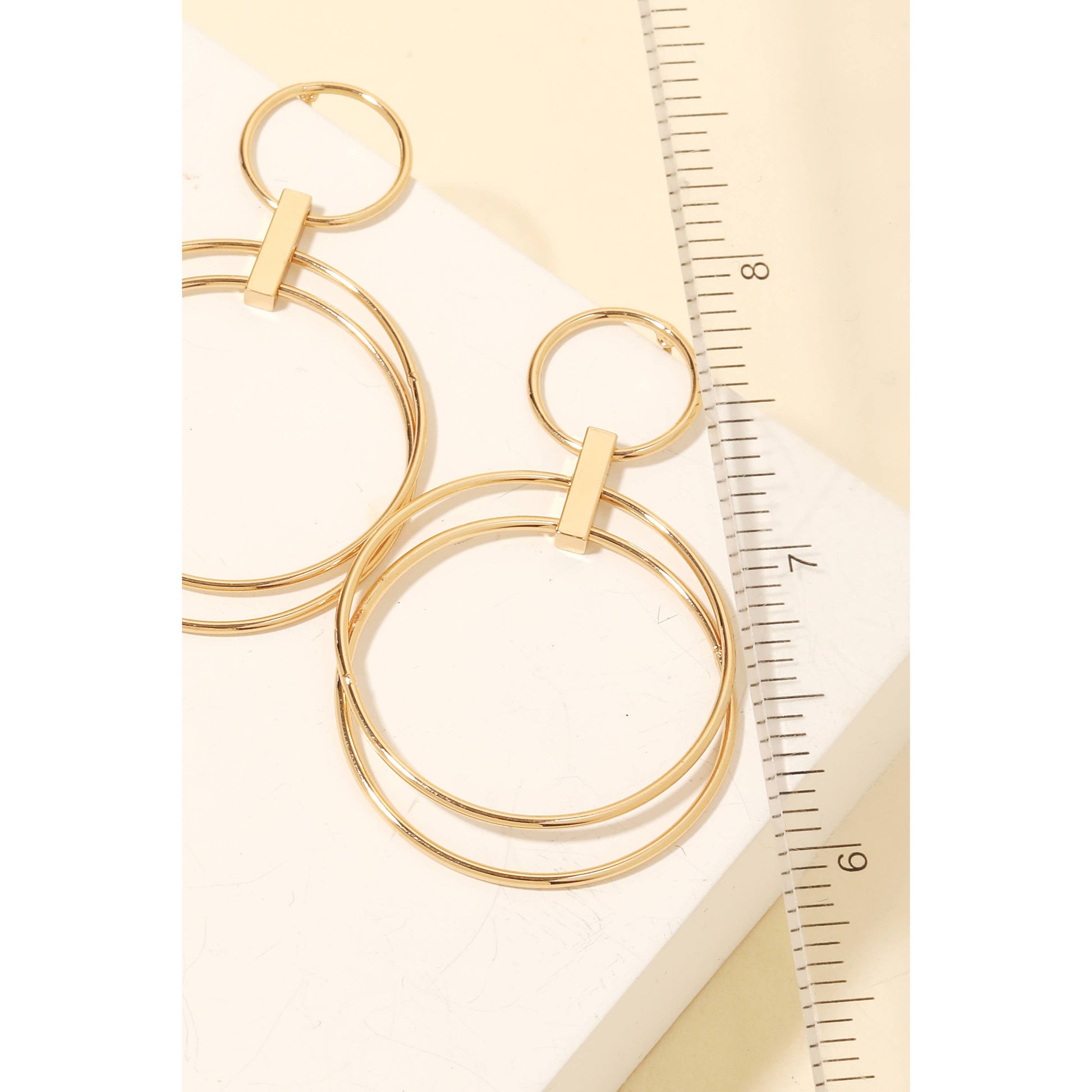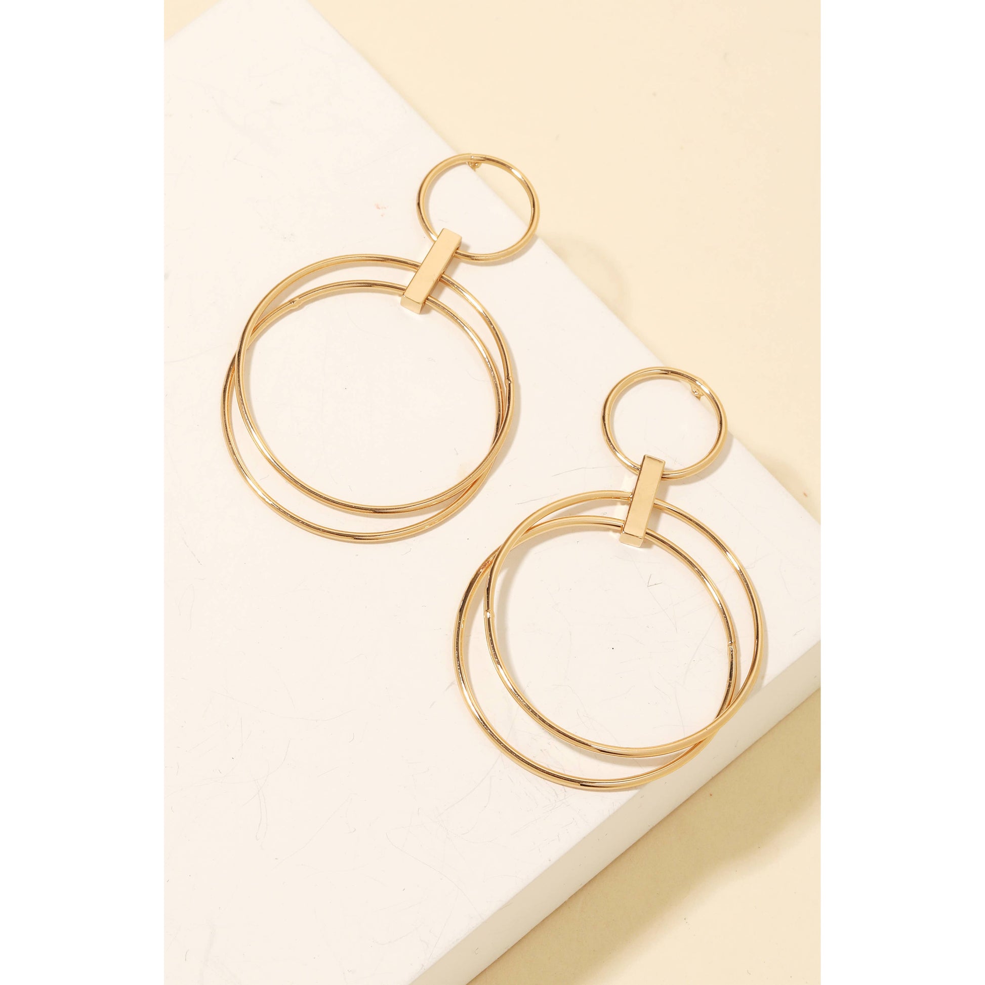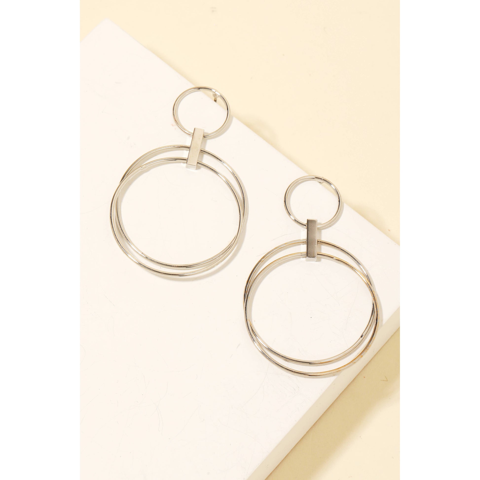 This season's must-have accessory, this pair of drop earrings highlights a special layered metallic hoop drop earrings design. It also includes a hoop stud post. Perfect for adding a pop of color or texture to any outfit, this accessory is a must-have. Available in G and S. This item is sold in packs of 1.