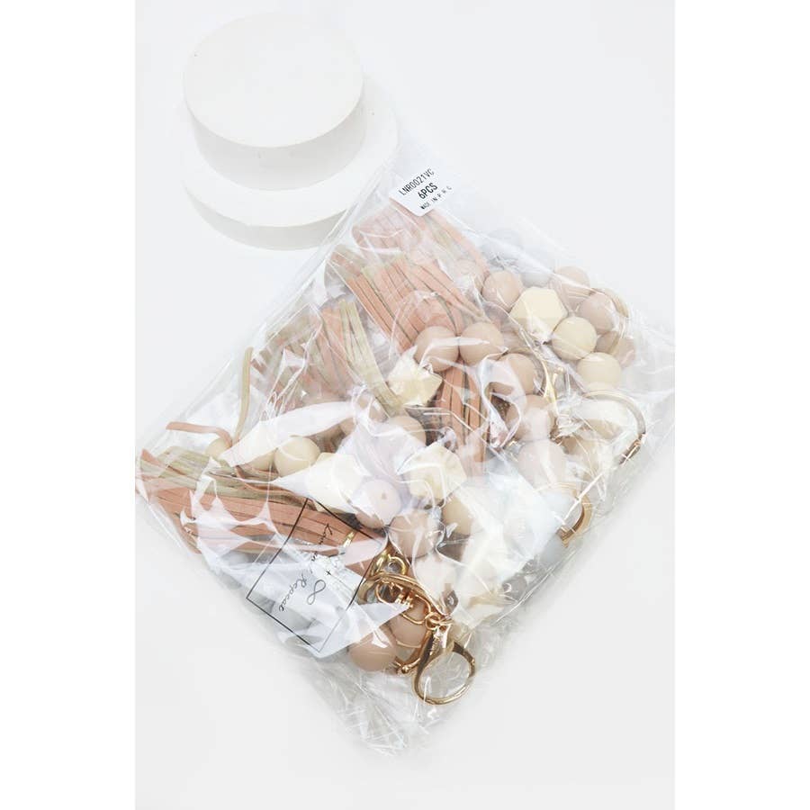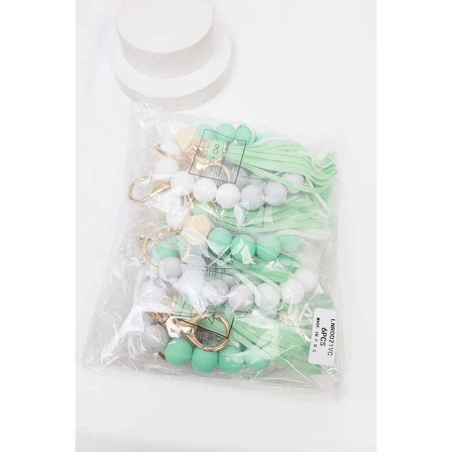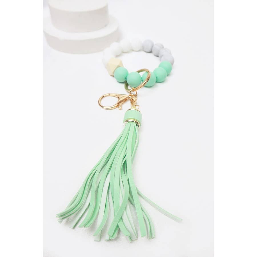 -Cute Key Holder Wristlet Chain with Leather Tassel, Car Key Ring Bangle Chain. This wristband keychain is made of acrylic beads and wooden beads. The beads will not stick to your skin scratch your skin, pull your hair, or cause any irritation. It is soft and comfortable for your soft skin. The keychain bracelet can be easily pulled apart and contracted.
